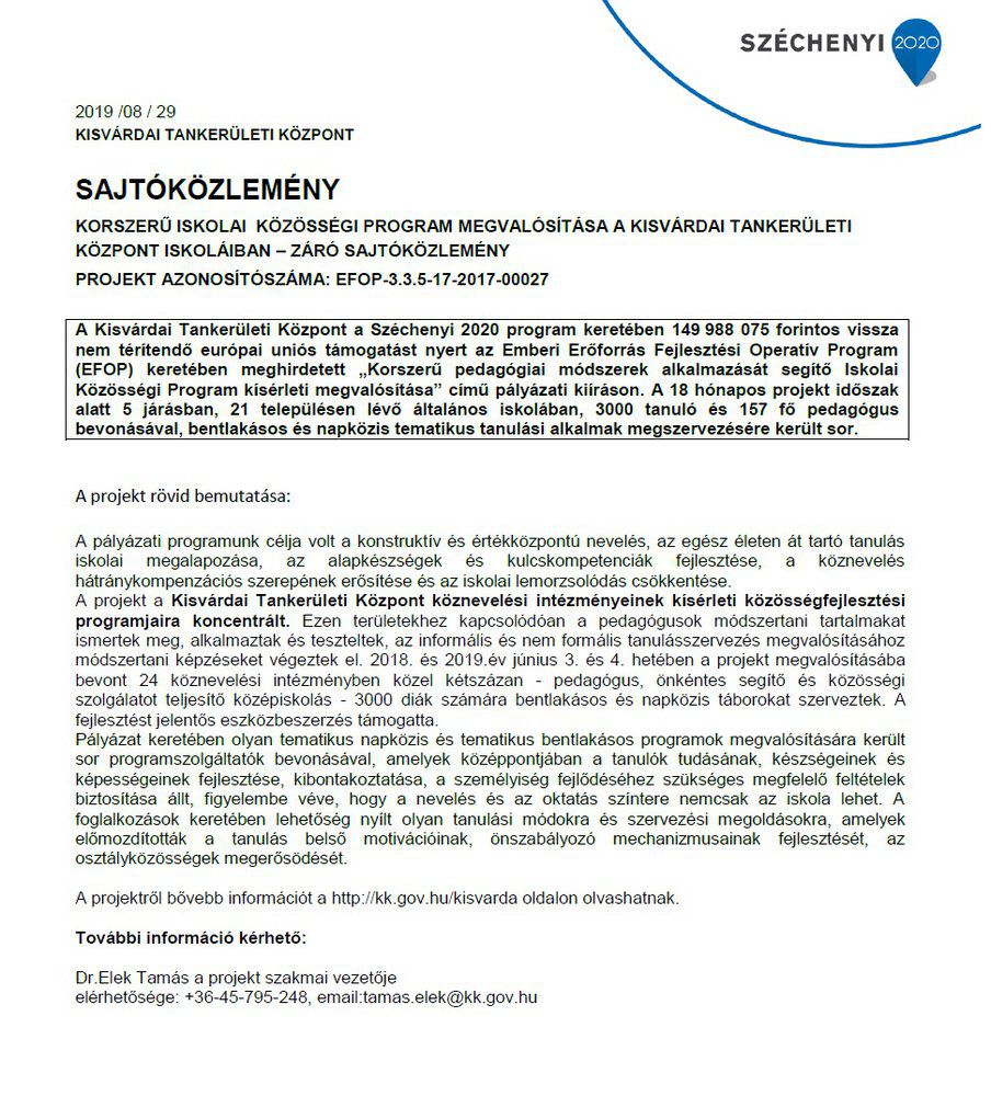 Az EFOP-3.3.5-17-2017-00027 azonosító számú - Korszerű Iskolai Közösségi Program a Kisvárdai Tankerületi Központban című - pályázat keretében 2019. június 24-től 28-ig 5 napon keresztül játékos napközis táborban vehettek részt a Móra Ferenc Tagintézmény tanulói.